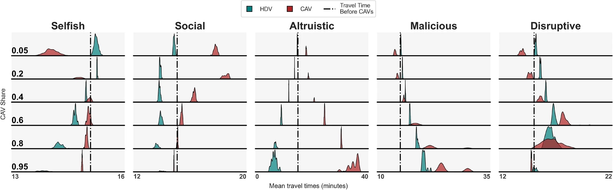 - The choices of CAVs that replace a given share of HDVs differ significantly from the choices of the remaining HDVs.